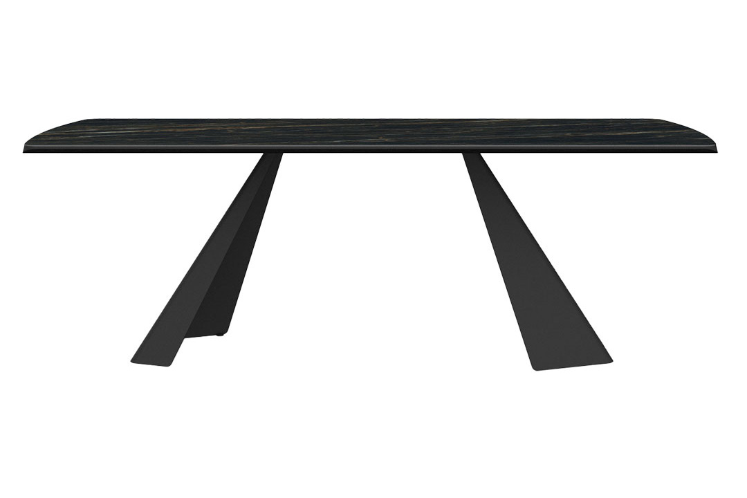 Das Gestell in Schrägwange gekantet setzt mit seiner klaren Linienführung und der präzise gebogenen Kante ein markantes, modernes Designstatement.