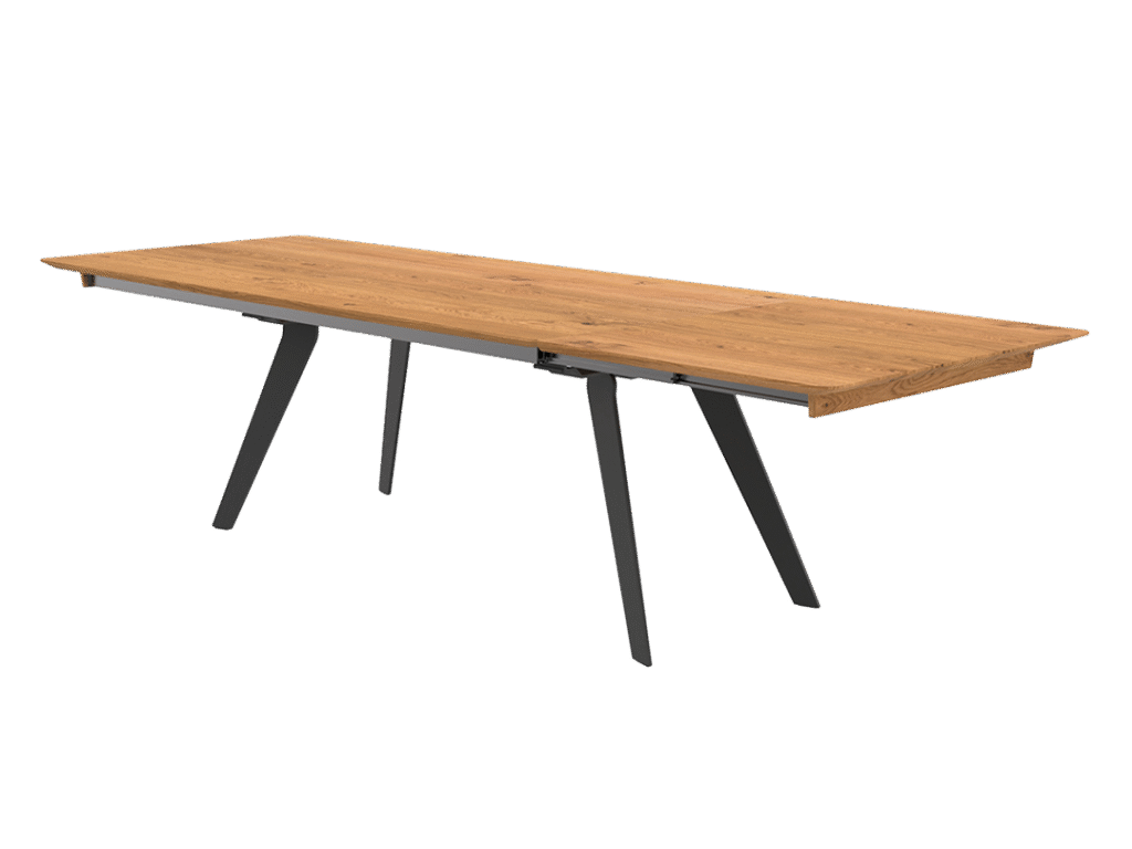 Tischauszug: bis 240 cm möglich, Synchronauszug mit 80 cm Klappeneinlage, weitere Auszugsgrößen im 5-cm-Raster zwischen 60 und 100 cm auf Wunsch möglich