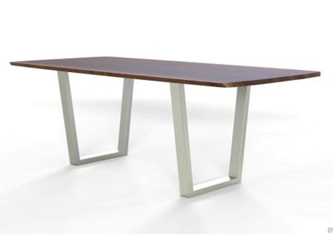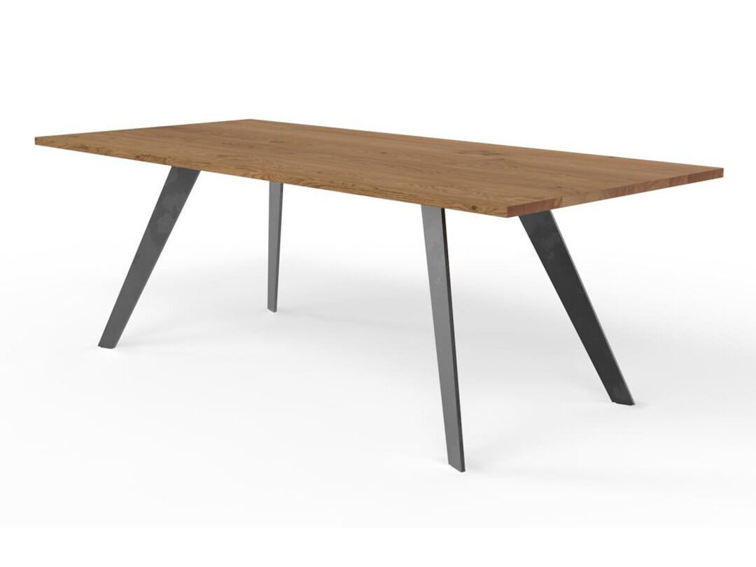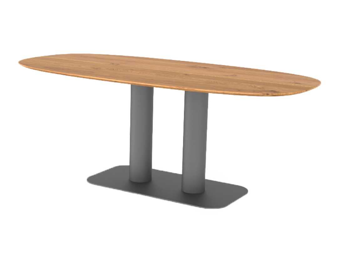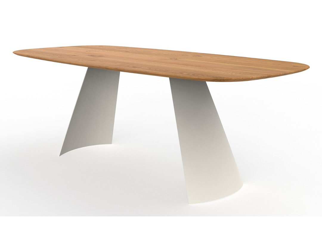 Die Tischplatte ist wahlweise in Massivholz oder Keramik erhältlich und in drei Formen verfügbar: Ellipse, Bootsform oder rechteckig mit sanft gerundeter Stirnseite.