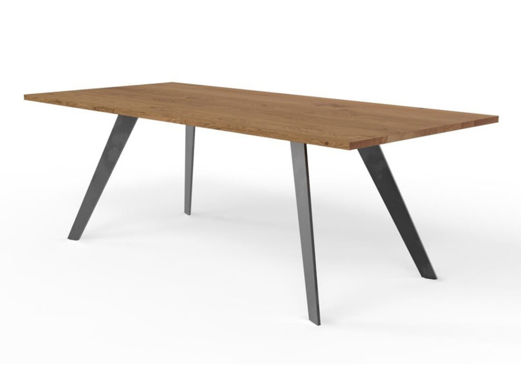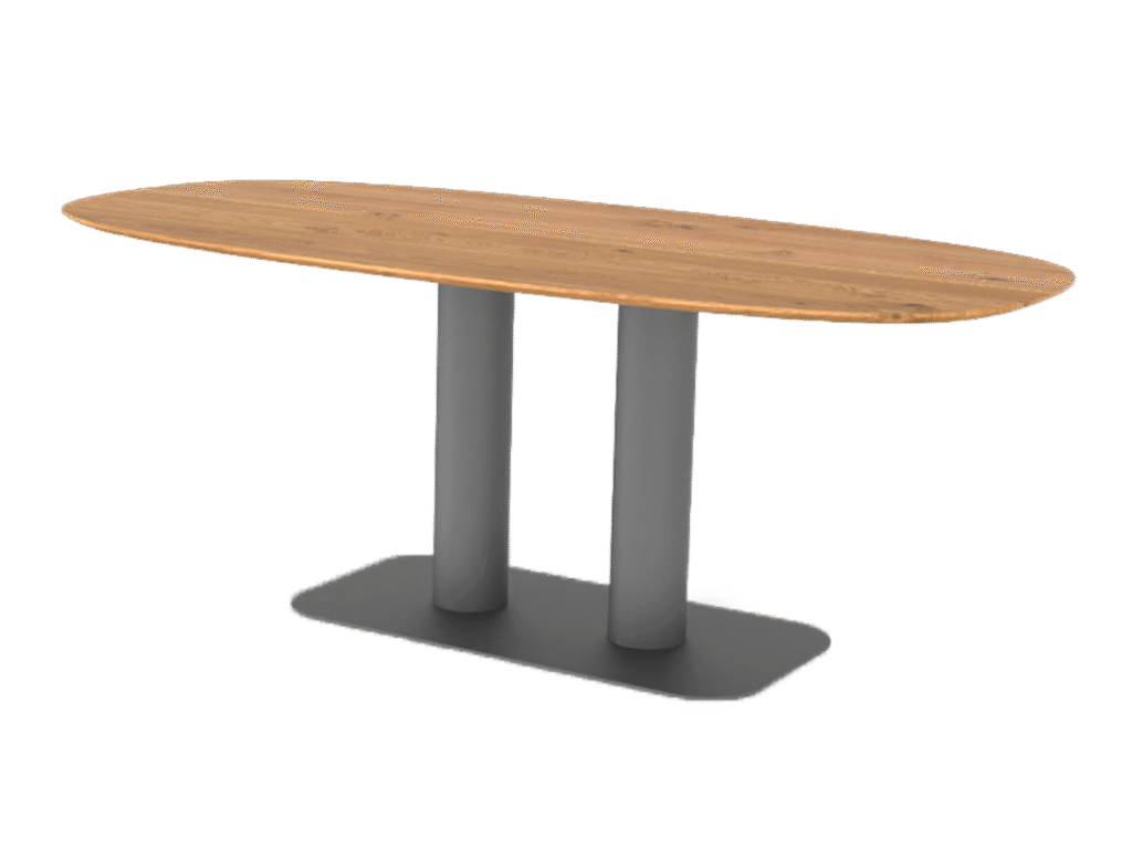Die Tischplatte ist wahlweise in Massivholz oder Keramik erhältlich und in drei Formen verfügbar: Ellipse, Bootsform oder rechteckig mit sanft gerundeter Stirnseite.