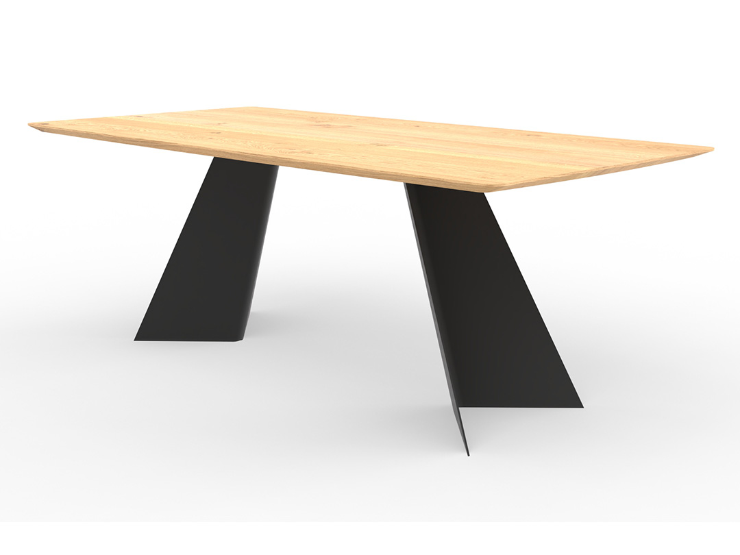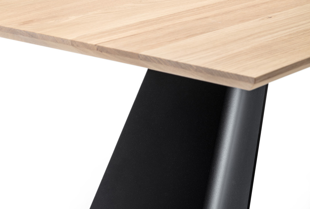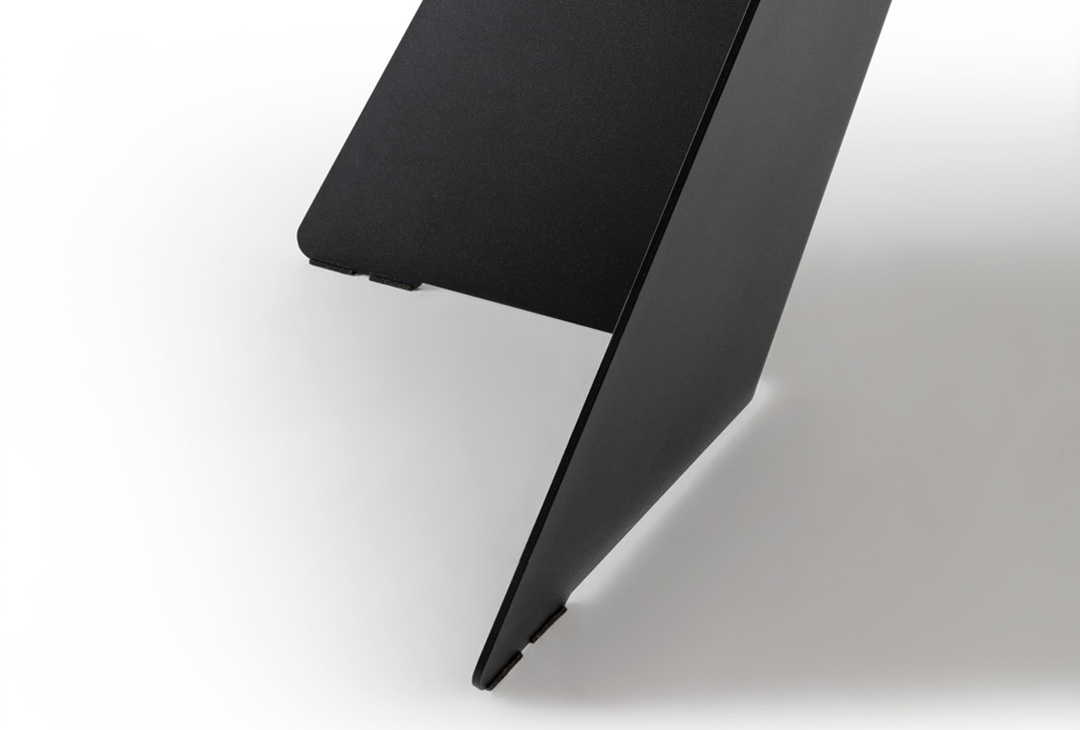 Das Gestell in Schrägwange geknickt setzt mit seiner klaren Linienführung und der präzise gebogenen Kante ein markantes, modernes Designstatement.