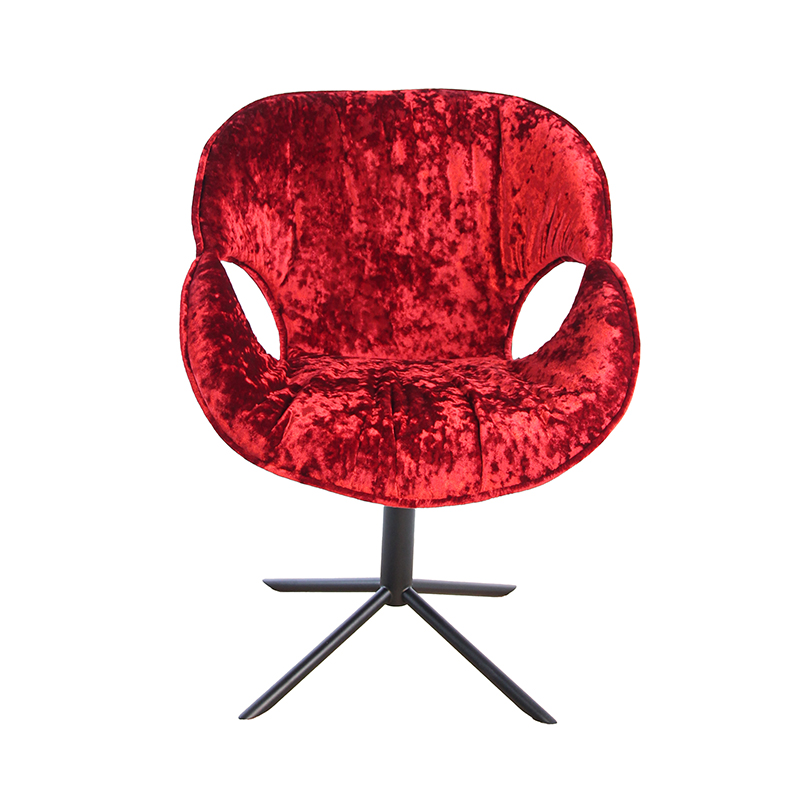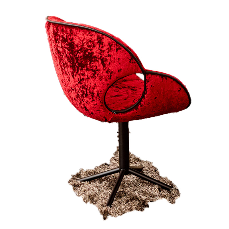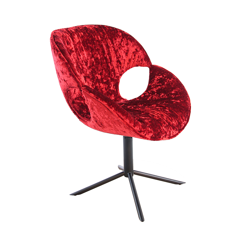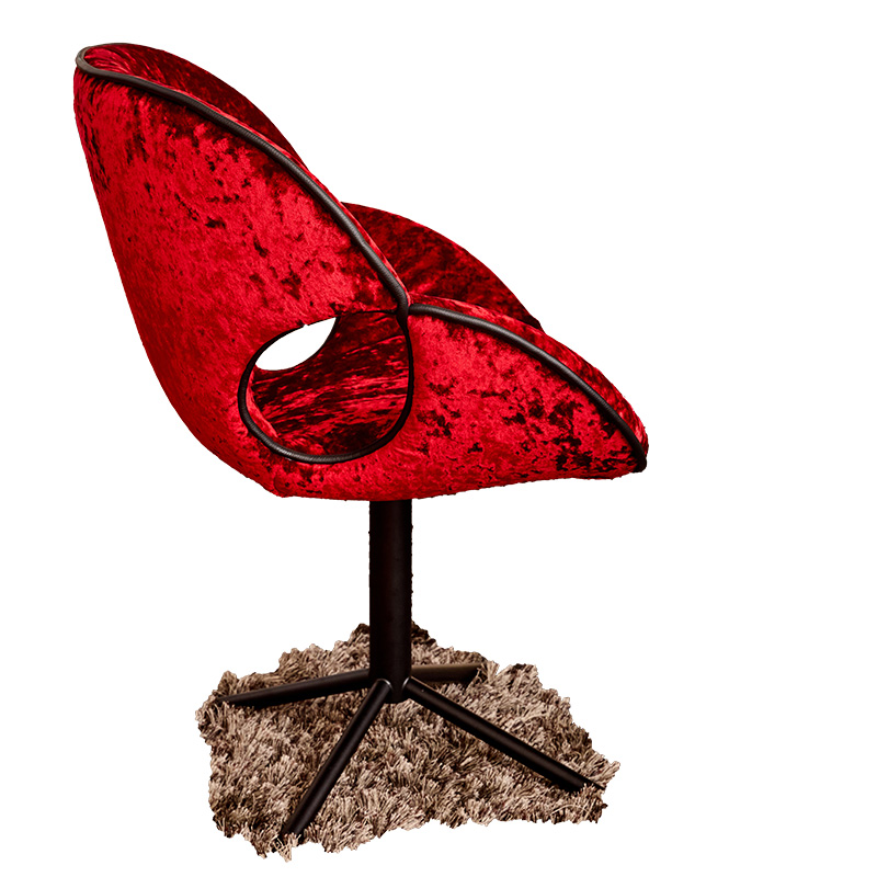Rückenlehne, Armlehnen und Sitzfläche verschmelzen zu einer harmonischen, rund geschwungenen Form, deren filigrane Armlehnen mit dekorativem Loch an die Anmut einer Blume erinnern.